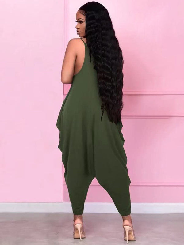 Material: Made of 81%-90% cotton, soft and comfortable to wear.Features: Solid color, loose harem, ruched, spaghetti strap, v-neck, sleeveless, pocket, casual, punk style, one-piece jumpsuit.