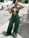Features: Solid color, halter neck, sleeveless, criss cross, lace up, ruched, wide leg jumpsuit, bodycon jumpsuit.