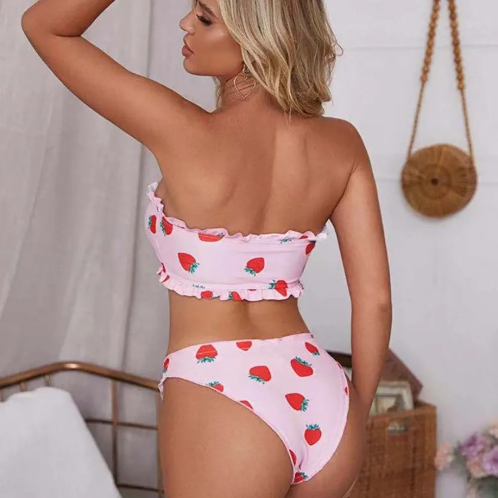 This Cute Strawberry Bandeau Bikini Set is a perfect addition to any beach wardrobe. The strapless. tube top design allows for maximum sun exposure without compromising comfort or coverage. The lightweight fabric is breathable and sure to keep you cool on hot summer days.