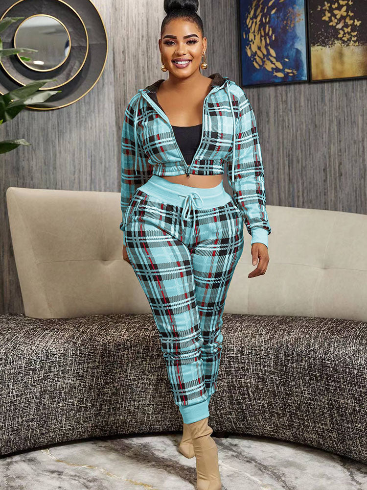 Features: Two-piece outfits, long sleeves, zipper, hoodie, crop top, plaid print, drawstring, long pants.