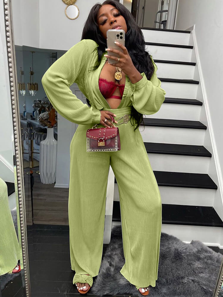 Two Piece Button Up Top & Long Pants Outfits Tiynon