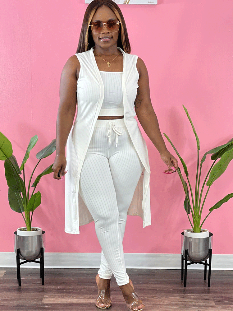 Features: Solid color, puff sleeve, bodycon,?sleeveless crop top, sleeveless cardigan, long pants, 3PC sets.