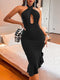 Feature:Off-shoulder, backless, crisscross, cut-out, ruffle hem, split, solid color, bodycon midi dress.