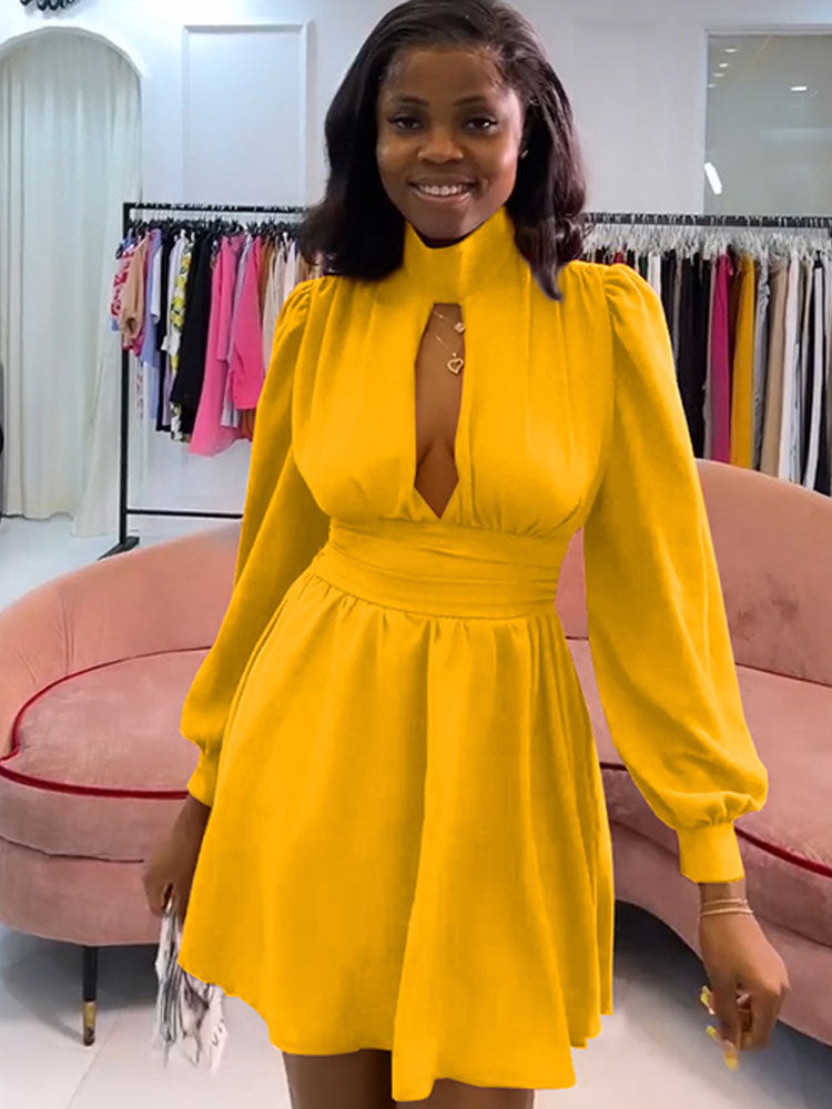 Features:Long sleeve, lantern sleeve, solid color, cut out, mock neck, zipper, tunic dresses, mini dresses.