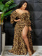 Feature: Off-shoulder. puff sleeve. shape neck. high-waisted. flowy. floor-length. leopard print. tiger print. split. maxi dresses.
