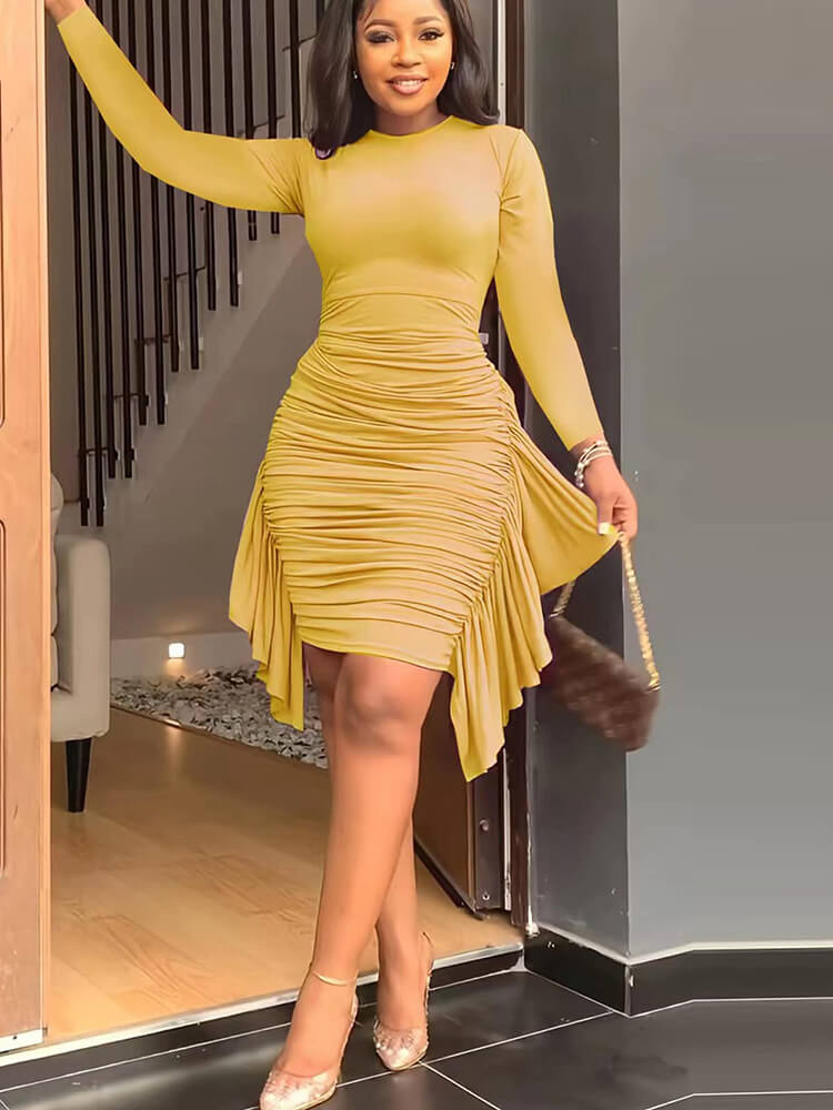 Features:Long sleeve, solid color, high waist, ruffle, ruched, bodycon, midi dresses.