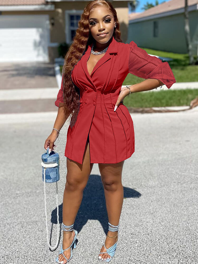 Features: Casual, Mini Dresses, Bodycon, loose fit, button-down blouse, V-neck, mesh bishop sleeve.