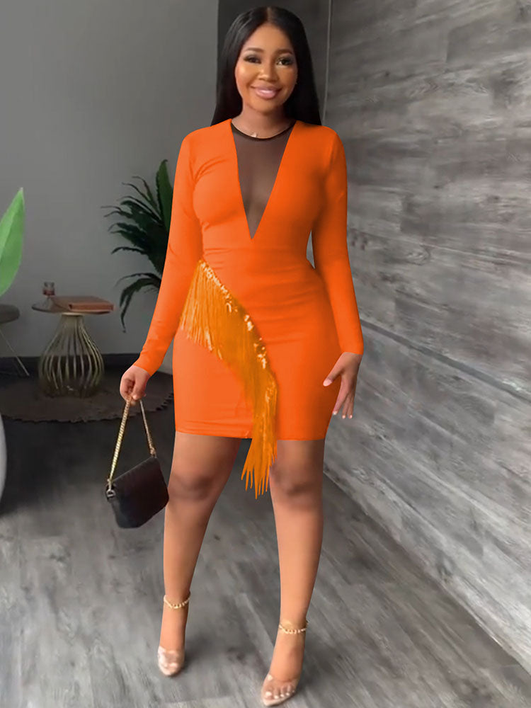 Features:Sheer mesh, see-through, solid color, deep v-neck, crew neck, long sleeve, tassels, bodycon, sexy, mini dresses.