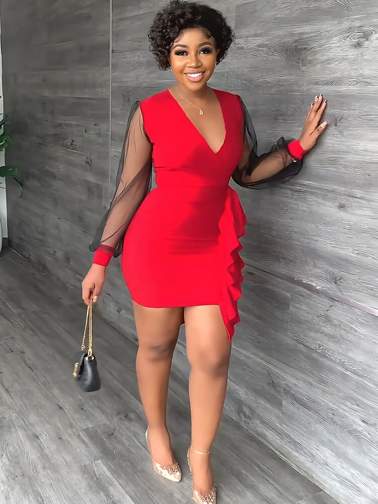 Features: Sheer mesh, patchwork, long sleeves, ruched, ruffle, zipper, solid color, bodycon mini dress.