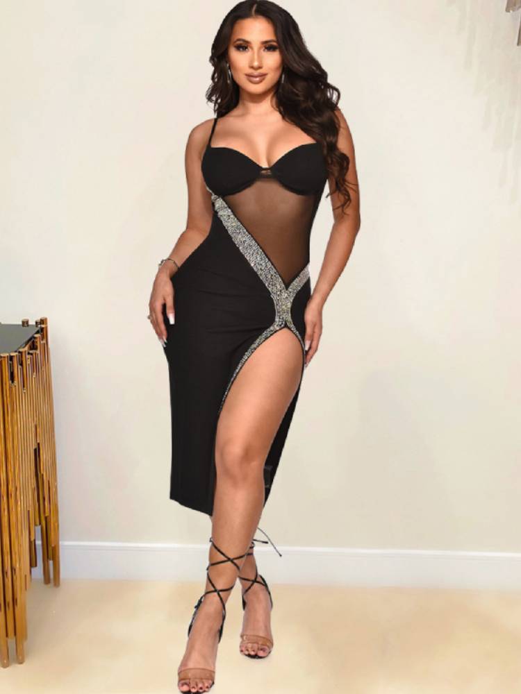 Features:See-through, mesh, patchwork, solid color, sexy, bodycon, spaghetti strap, sleeveless, backless, rhinestone, split, midi dresses.