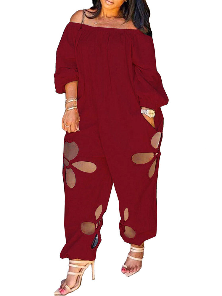 Features: Long sleeve. off-shoulder. solid color. elastic cuff. hollow out. jumpsuits.
