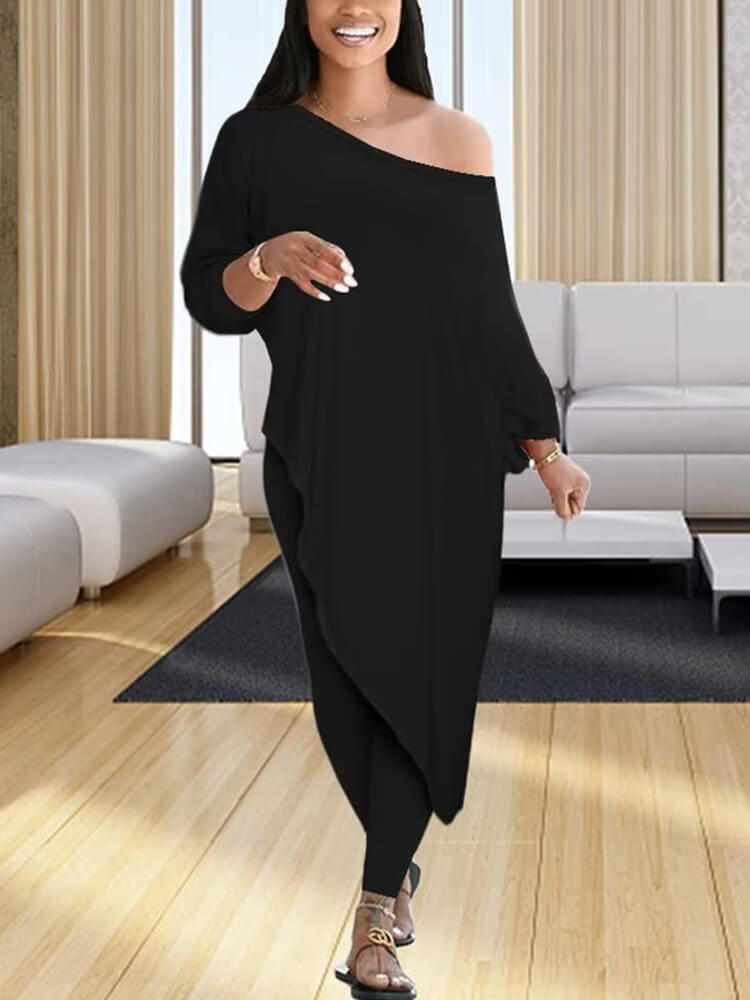 Features: 3/4 sleeve, solid color, off-shoulder, irregular hem, high waist, bodycon, long pants,
