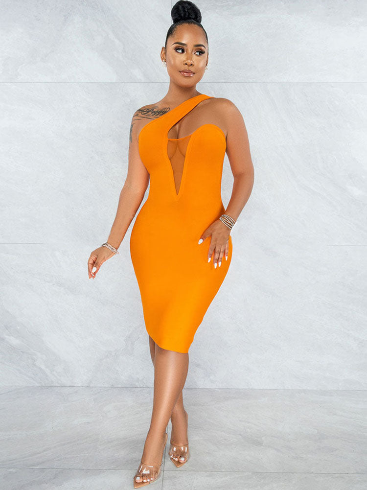 Features:Stretchy, one-shoulder, sleeveless, solid color, mesh, patchwork, backless, sexy, bodycon midi dresses.