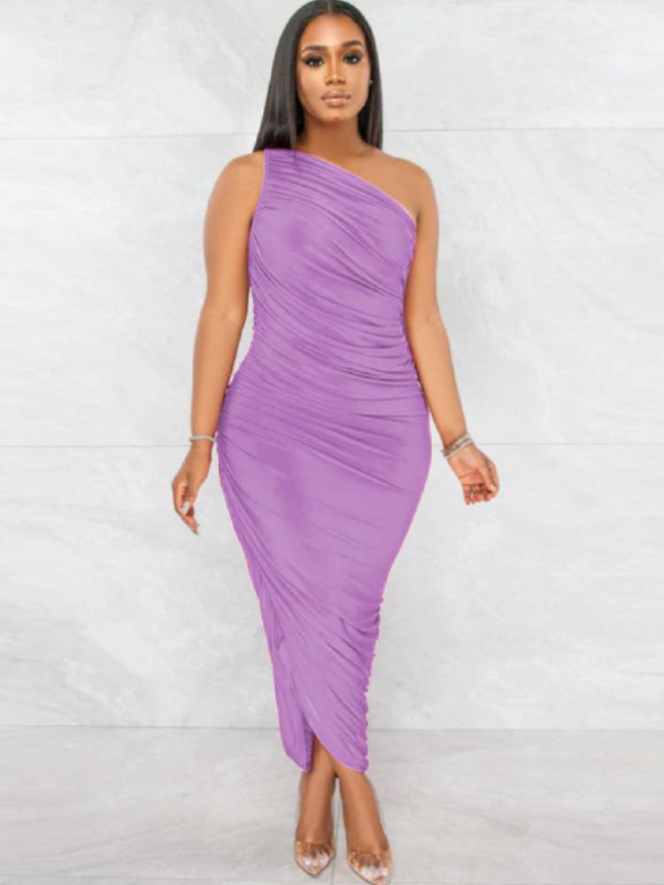 Features:One-shoulder, sleeveless, solid color, ruched, backless, asymmetrical, bodycon, maxi dresses.