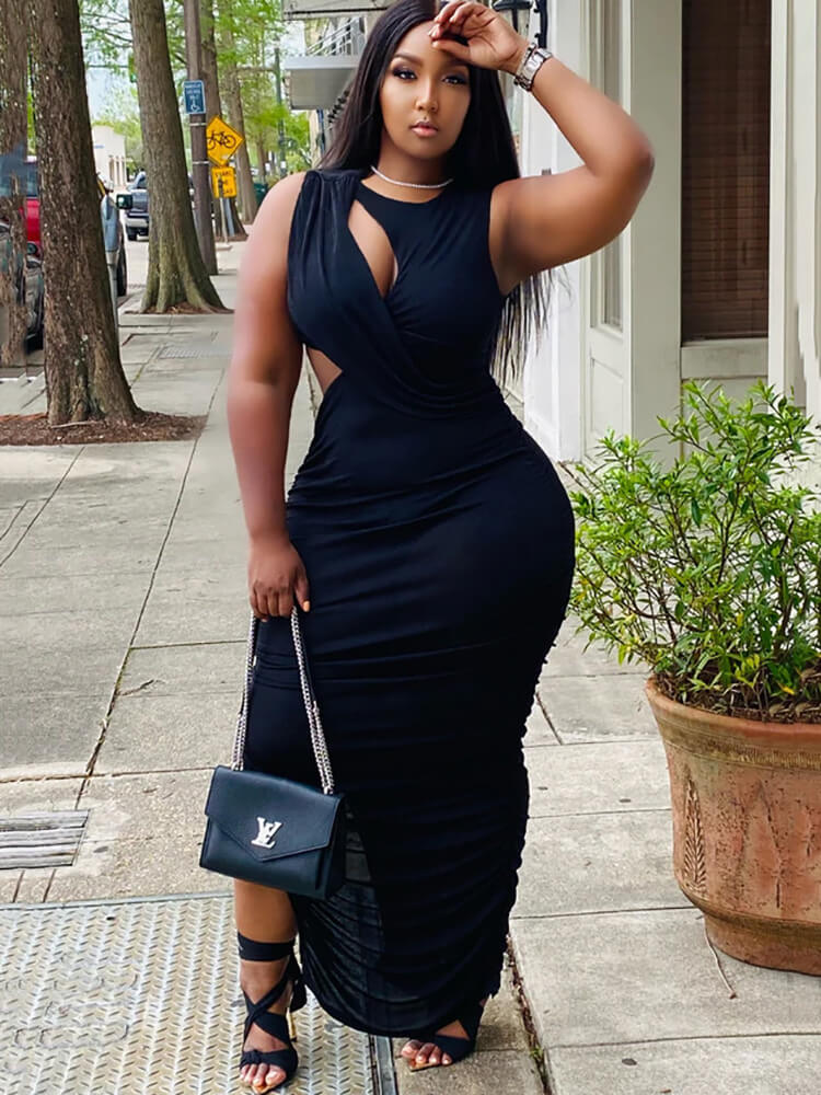 Feature: Sleeveless, round neck, solid color, ruched, casual, hollow out, bodycon, split maxi dress,high waisted dress set Looming to show your unique attraction to catch the eye of all men.