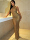 Sleeveless Mock Neck Backless Rhinestone Maxi Dresses