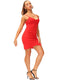 Features: Spaghetti straps, knit, ruched detail, zipper closure, above knee length, and bodycon fit.