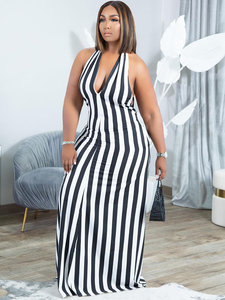 Features:Striped Print Dress, Sleeveless, Backless, Lace Up, Deep V Neck, Bodycon, Slim Fit, Maxi Dress.