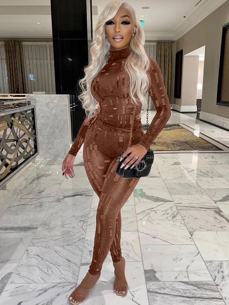 Features: Two-piece outfits, knit, mock neck, solid color, hollow-out, long sleeves, bodycon pullover, long pants.