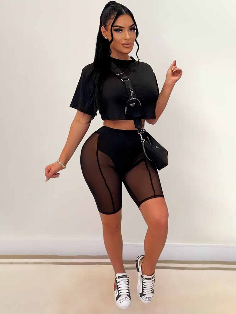 Feature: Mesh. patchwork. see-through. short sleeve. round neck. solid color. bodycon. crop top. short pants. pants suit. two-piece outfits.