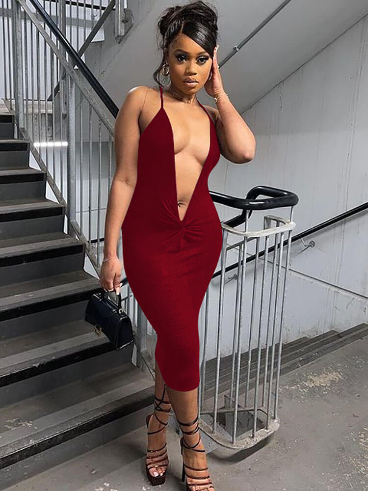 Features: Sleeveless, Halter, Bodycon, Solid Color, Deep V Neck, Backless, Cut Out, Pencil Dress, Ribbed, Glitter, Midi Dresses.