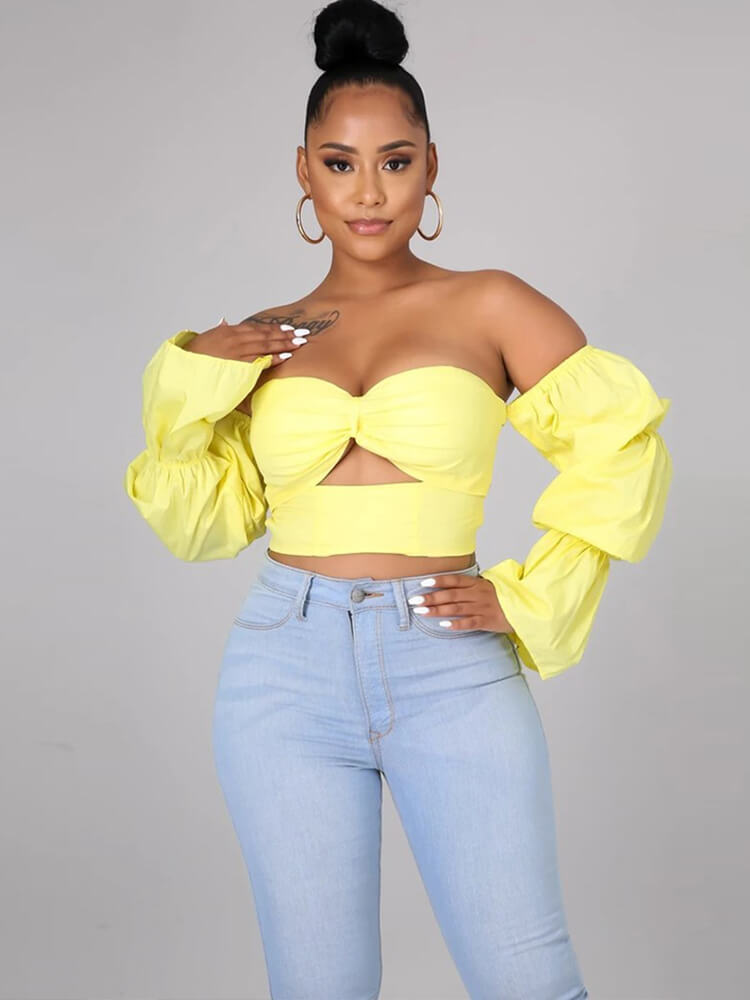 Feature: Long Sleeve, solid color, off the shoulder, cut out, bodycon, hollow out, crop top, ruffle.