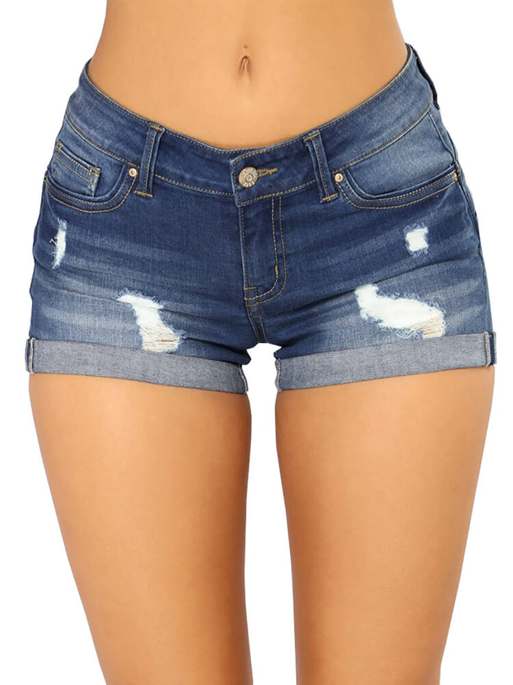 Features: High waist, ripped, solid color, pocket, button, denim, shorts.